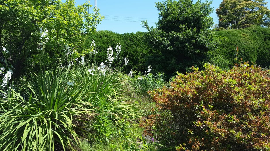 花畑と裏庭を分断するように立ちはだかって風を止めていたカイズカイブキ。