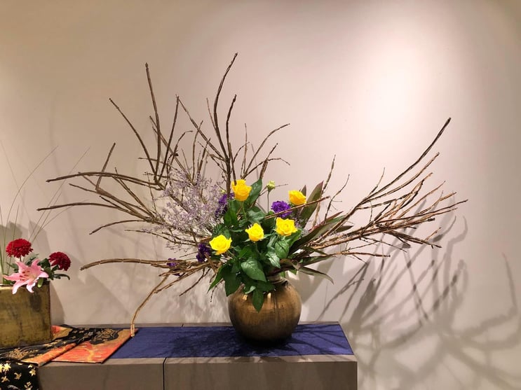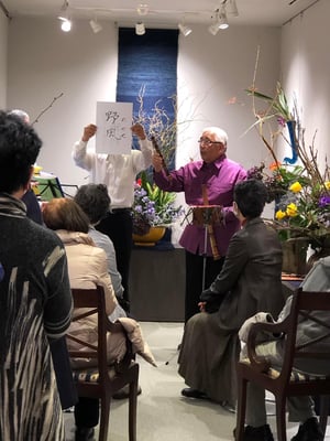 大変華やかな時期に、コロナの影響も弱まり、念願の華展を叶えることができました。席票は康越書。